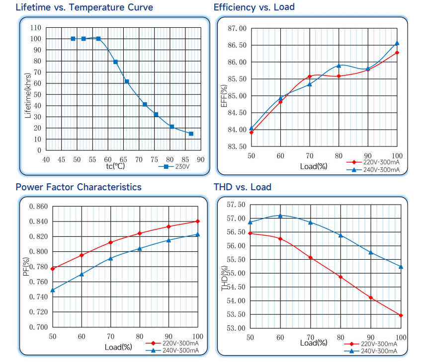 | Models | Power | Input Voltage | Output Current | Output Voltage | Efficiency | Power Factor | Size |